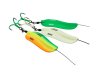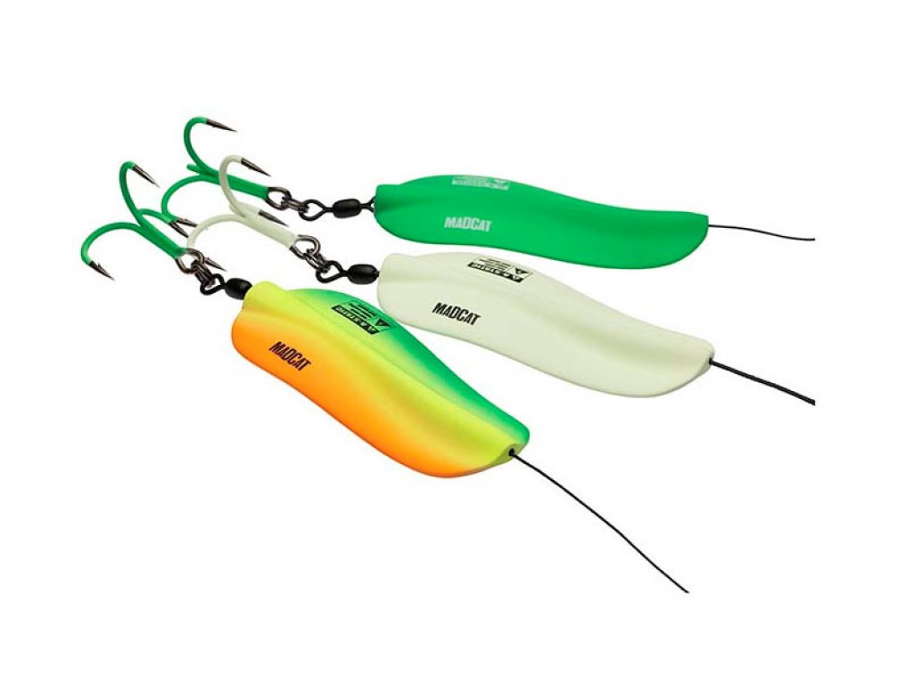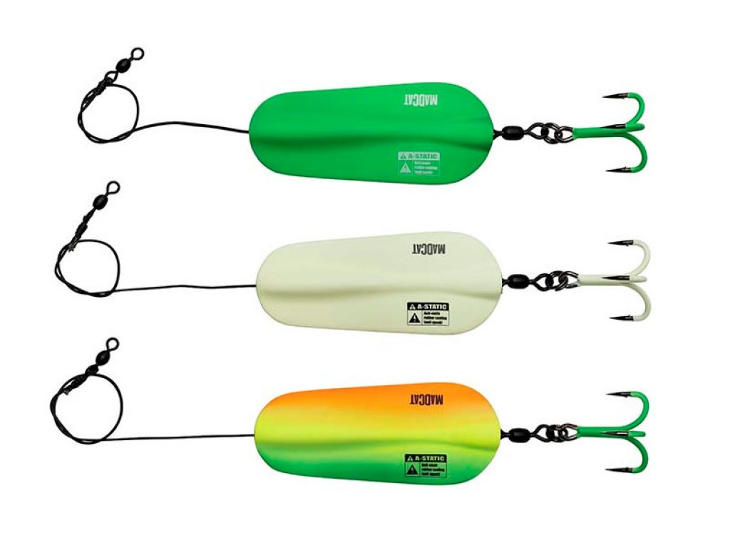 Heavy, inline catfish spoons suitable for casting long distances. The advantage of the inline construction is that a catfish cannot use the blade as a lever in an attempt to get rid of the lure, because then the spoon will simply slide away from the treble, up the leader. Treble size: 3/0. A-STATIC, meaning: rubber coated, to minimize the electric field that spooks catfish. Note: the rubber coating can wear off during usage.