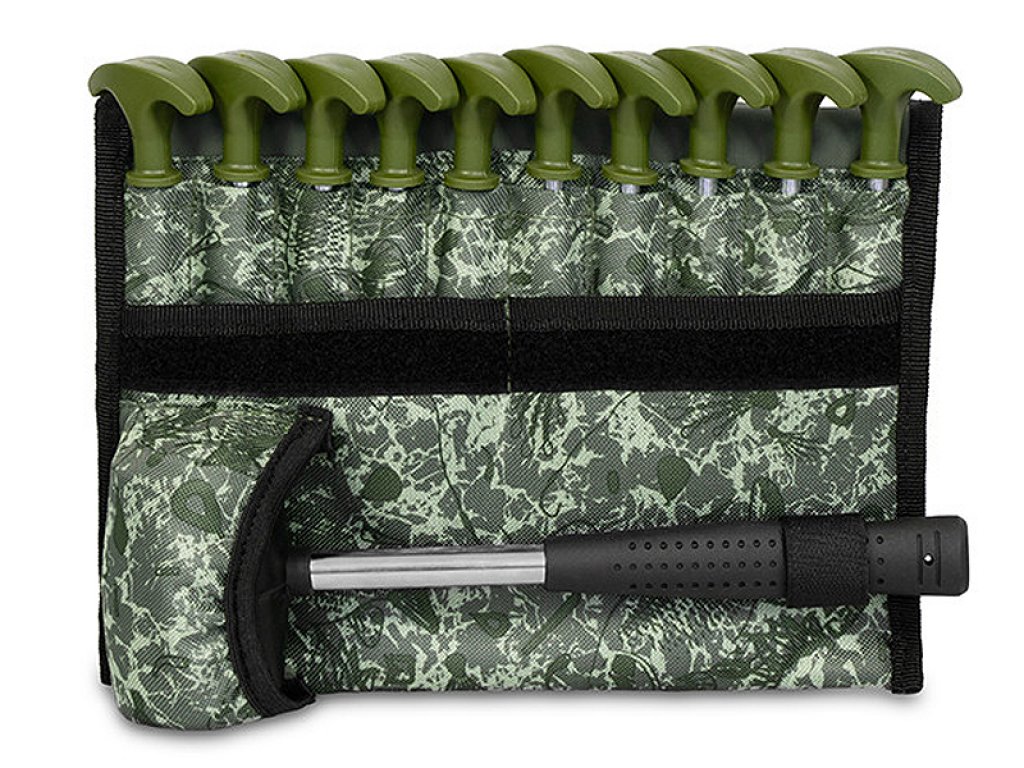 A set of 10 sturdy metal stakes with a hammer in a practical pouch with a C2G design.