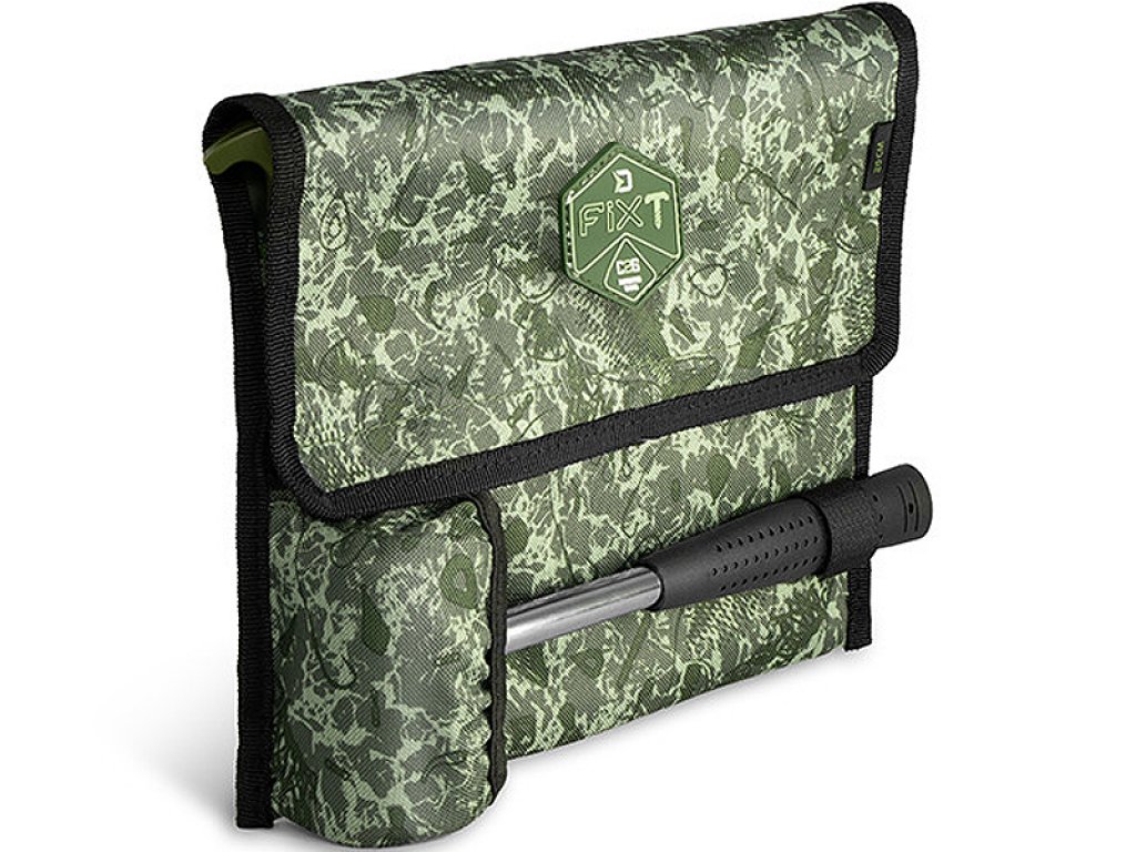 The pouch is made from heavy duty fabric with rubber on the inside. The hammer and the stakes are fixed during transport so you don’ have to worry about losing them.