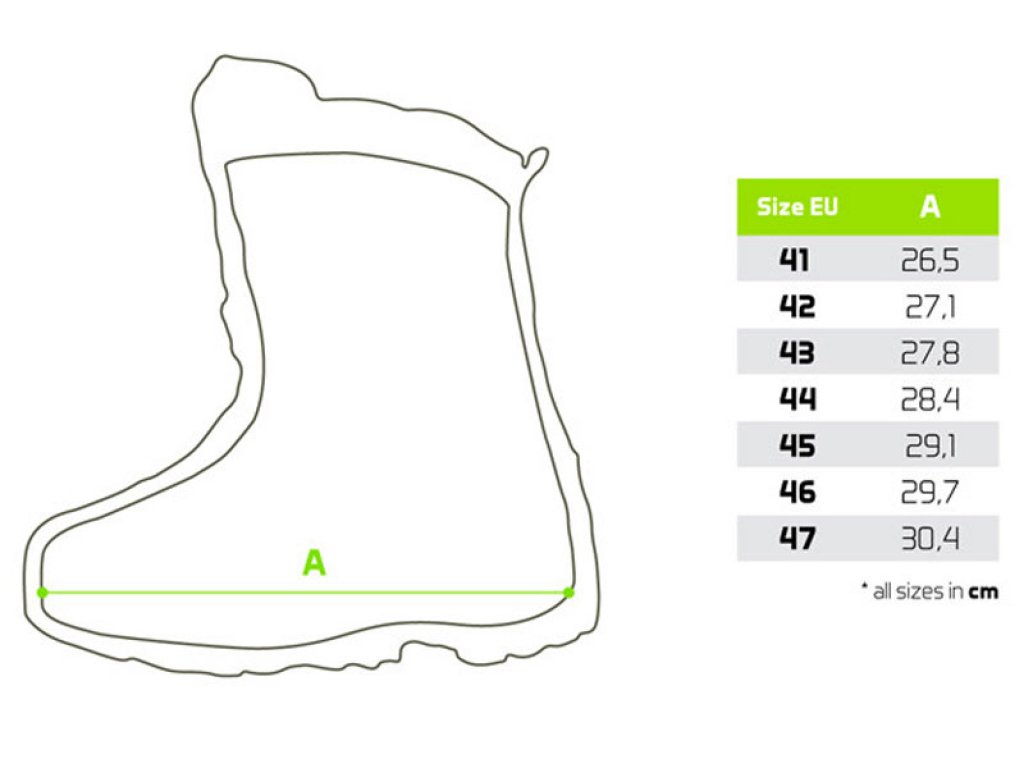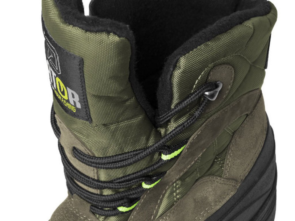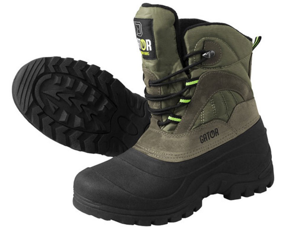 Delphin GATOR shoes are designed for extreme expeditions especially in colder times of the year. The raised rubber rim of the sole reaches to the height of the ankles, which means walking in puddle, melted snow and mud is not a problem for GATOR. This rubber part is also very easy to clean. In the back of the rubber part of the shoe there is a protrusion, thanks to which you can take off the shoe without problems. The upper part is made of a combination of durable nylon fabric and artificial leather. These materials resist bad weather and are easily impregnated if necessary. The tongue of the shoe is sewn to a height of 17cm, which means that you can move in such deep damp areas for a short time. The lacing is done through textile eyelets, at the top of the lacing there is one metal eye. The inside of the shoe is made of a comfortable microfleece. Thermal comfort is provided by a layer of an artificial microfiber between the outer and inner layers. The black and green combination of materials will be appreciated not only by fishermen, but also by hunters, hikers and all other nature lovers. Despite the robustness, shoes are very lightweight, which certainly comes in handy for a longer walk.