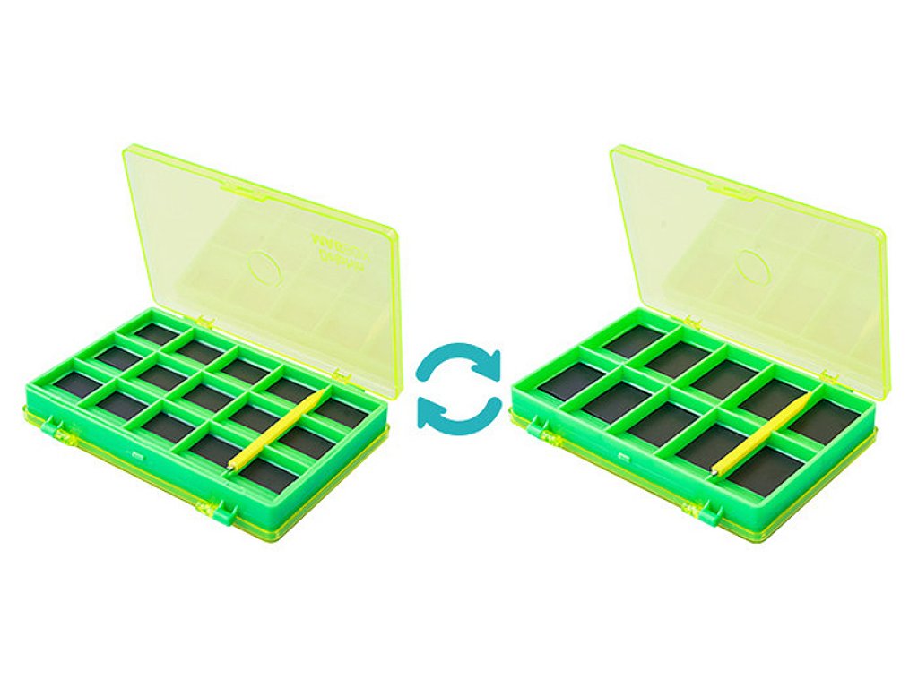 A necessary accessory for any fisherman, this is Delphin MAGBOX where you can store all your small metal parts of your fishing equipment, especially fishing hooks. The box is double-faced, there are ten bigger compartments (2,5x 2,2cm) on one size and 15 smaller compartments (2,1x 1,3cm) on the other side. It can also be used for swivels or snap-hooks. You can store the accessory according to their size or any other criteria to individual compartments and you can be sure that they will not spill out. In addition, they will not get dull there. They all stay in their place until you take them out with a special tool that comes with a box. The box is made in distinctive colour so you do not lose it and you always have everything at hand.