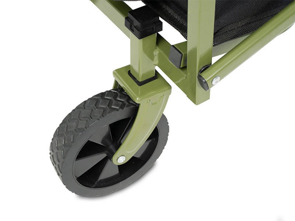 Delphin MOOVE is an ideal solution for easy transport of your fishing gear to remote places with limited car access. It’s suitable for all anglers who have had enough of carrying their equipment. Our priority was to create a cart that’s easy to store, durable, and quick to fold/unfold. The metal structure allows folding it in a way that won’t take up almost any space and that will fit easily in a boot of a small car. In addition, the cart has a lot of storage space to accommodate your gear necessary for shorter fishing trips. It’s made from an extra sturdy fabric that can handle a heavy load. The structure and the storage area are connected with velcro zips, so it’s easy to clean it up and dry it out. The cart Delphin MOOVE is fitted with durable plastic wheels. The front wheels are revolving for an easier manipulation and direction changes. They are durable against forces and practically impossible to slash. There is also a telescopic handle with a plastic grip. It can be folded with the button placed on the handle and a plastic clip is used to click it in and fix the handle in place. Plus, there are two holders in front you can use for bottles or other equipment. The loop placed on the bottom of the storage space makes the folding easier. For simple transport of the folded cart, there are grips on both sides.
