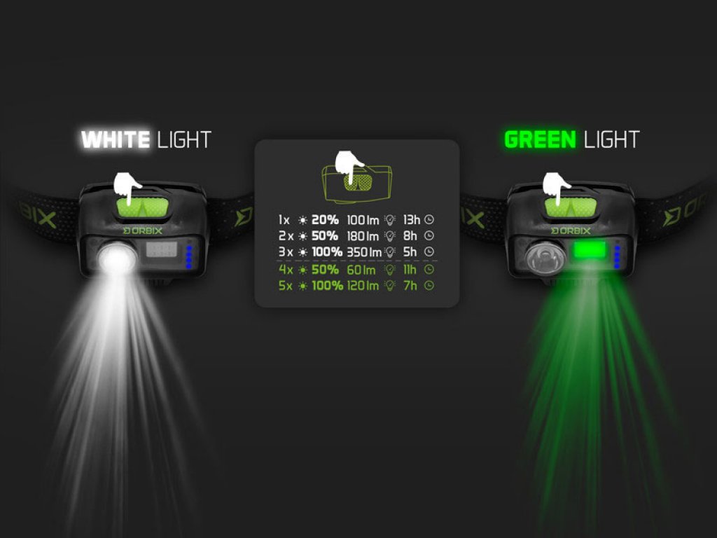 There are two LED diodes with the option of white or green light. When you press the button for the first time, it activates the white light with an intensity of 20 % (100lm) that lasts 13h. By pressing the button again, the mode of 50% intensity gets activated, lasting 8 hours. When you press the button for the third time, it activates the white light with 100% intensity that lasts for 5 hours.