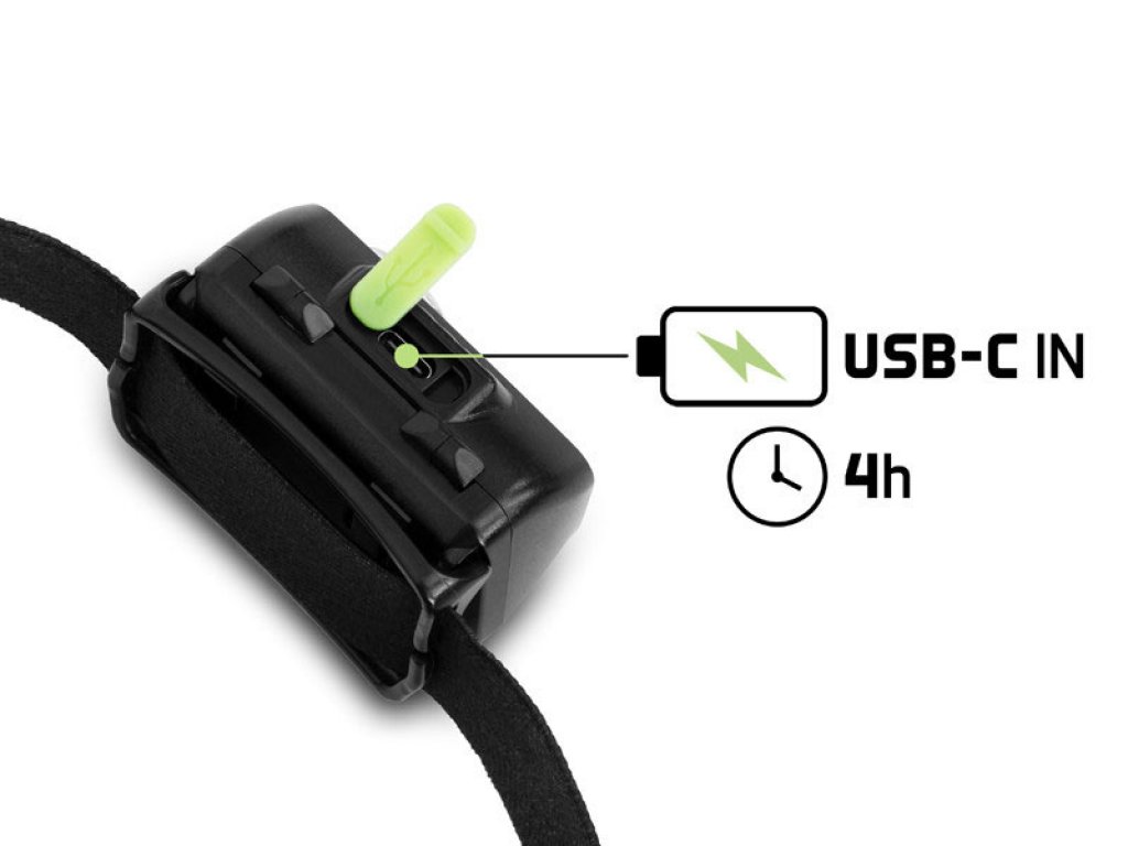 The headlamp has a 1200 mAh built-in battery charged via USB-C cable. It takes 4 hours to charge it completely. There is also a battery indicator on the headlamp.