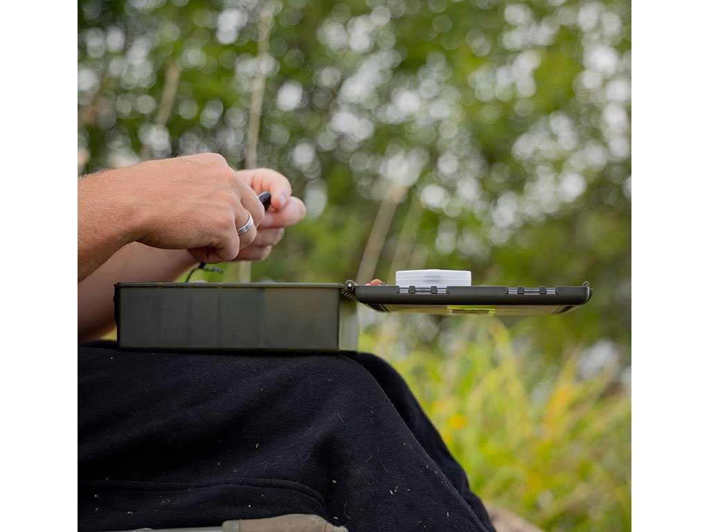 When opened the lid stops at exactly 180 degrees, this makes tying up rigs with your tackle box on your lap easy as you can use the inside of the lid as an area to work from. The lid also features a ruler on both the inside and outside to aid with rig tying.
