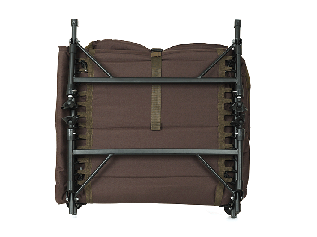 Strap and buckle system allows for bed to be packed away compact even with a sleeping bag on