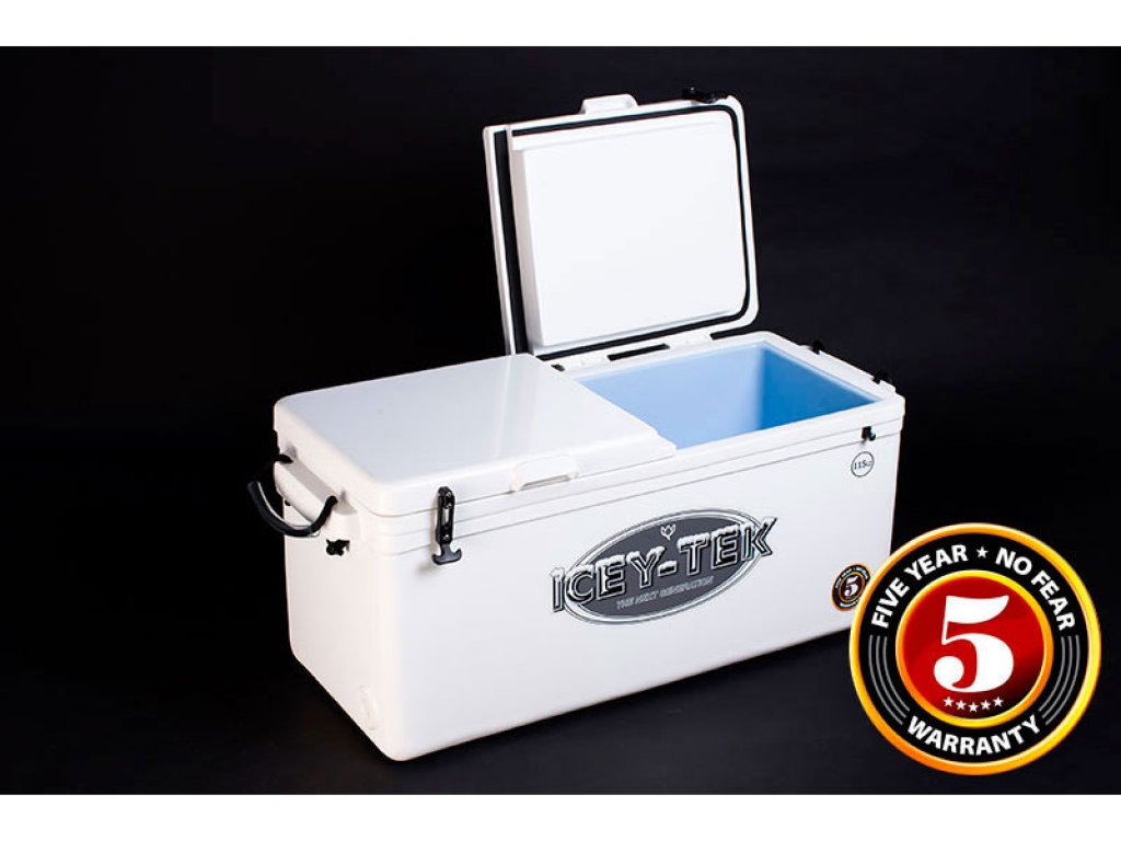 This Product has been made from premium components & materials to create the ultimate in a commercial quality icebox for your enjoyment. Superior ice retention obtained by utilizing premium polyurethane insulation injected under pressure within wall cavities and lids. Ultra heavy duty self stopping lid hinges. Easy Grip integrated moulded grab rails for ease of carrying. Innovative commercial grade skin protecting skids on bottom of all coolers. Lid Latches made from flexible, black thermoplastic elastomer material.