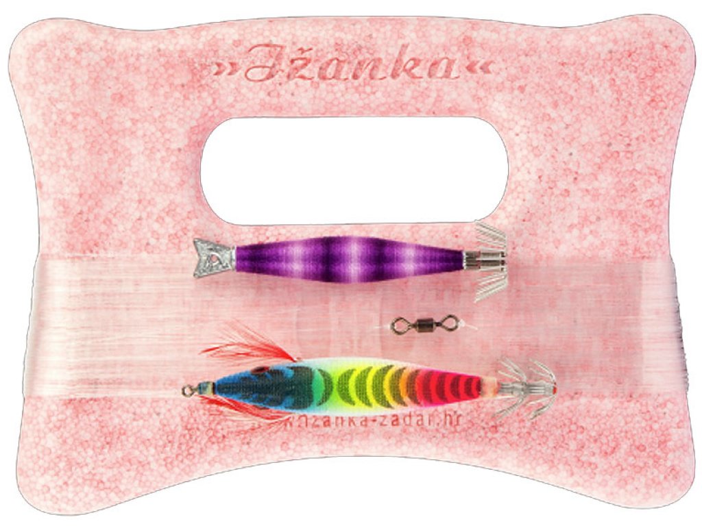 Squid jig + pescafondo is intended for complex and dynamic squid fishing from an anchored vessel with a submerged light. The light should be turned up until small bluefish are gathered, then turned down. The ideal depth for fishing is 20-25 m, and it is preferable that the bottom is overgrown with grass. The best position for fishing is at the entrance of the bay. Squid jig + pescafondo consists of a solid reel with a handle designed especially for that purpose, for fishing from a boat. It is fished from the hand, which provides the angler with direct contact with the fish. The shape of the reel allows easy unwinding of the nylon during fishing and reeling in after completion. The hunt begins by lowering the reel into the sea and unwinding the base. As a decoy, swimming squid jig and pescafondo are used. The length of the released base from the lures should be adapted to the depth and configuration of the bottom.