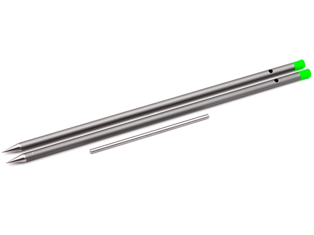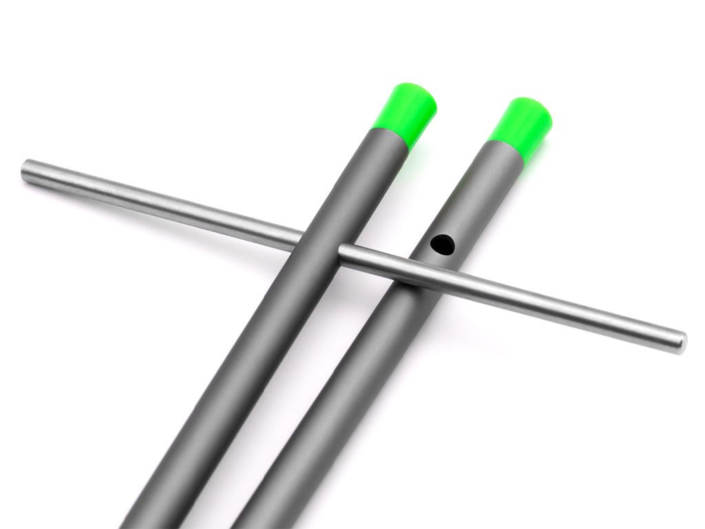 The BASIX Distance Sticks have designed to allow you to ‘clip-up’ at the required distance as easily and accurately as possible, ensuring that you can recast to the same spot repeatedly with your fishing rods and spod. Keeping a record of your spots will also mean that you are able to fish them again on future sessions, should you find ones that are productive. BASIX Distance Sticks have a stainless-steel point to allow them to easily be pushed or screwed into the ground, and includes a green cord of exactly 12ft in length so that they can easily be set the same distance apart each time. A T-bar is supplied to ensure they go into almost any ground with ease. The BASIX Distance Sticks are made from a stylish grey anodised aluminium with bright green end caps on the top for increased visibility – especially in low light or when using them with a headtorch at night. The caps can be unscrewed so that the T-bar can be stored inside, to ensure it isn’t lost when not in use.