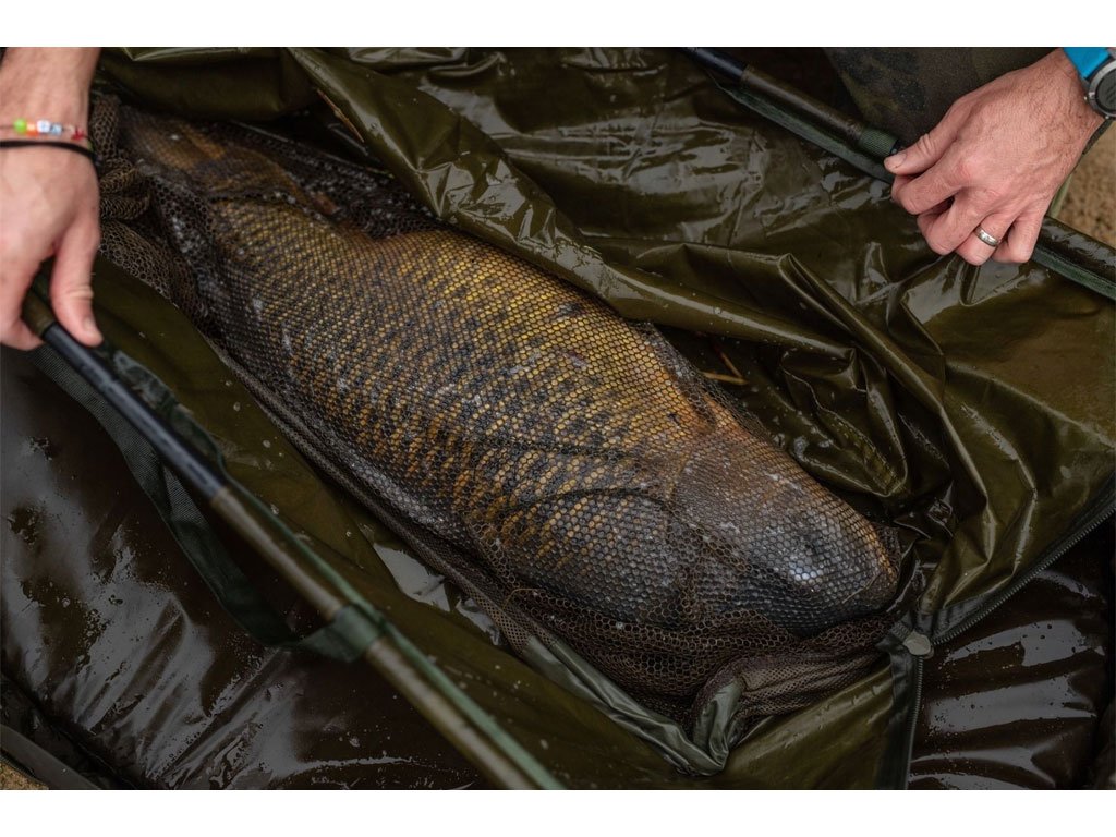 A strong webbing strap is attached to the bars on each side and give good balance once they are attached to the hook on your scales, allowing the fish to be weighed safely. It features plenty of large drainage holes along the bottom, so once the fish is transferred into it in the margins, in your rolled up landing net, the water will quickly drain out when you lift it out and carry it to your unhooking mat.