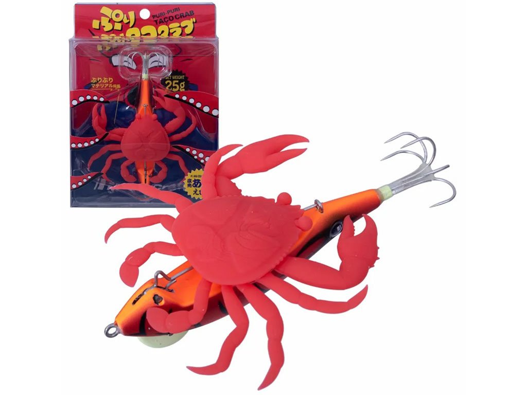 Major Craft’s Puri-Puri Taco Crab is a particular Tako Eging lures! It can be used both vertically from the boat and from the shore, it combines a rigid body and a biting crab. The Puri-Puri Taco Crab, in fact, is formed by a rigid body that has a small fluorescent lead in the front and a five-pointed hook in the rear part. Internally it has a rattle system which, producing a very strong sound, attracts the octopus more. In the upper part there is a needle with the “One-Touch” system that allows, with a single touch, to replace the soft bait at will. In fact, in addition to the soft crab that comes in the package, you can use different colors or other types of soft baits (sold separately), which can be changed according to the situation. Fresh Bait can be added.