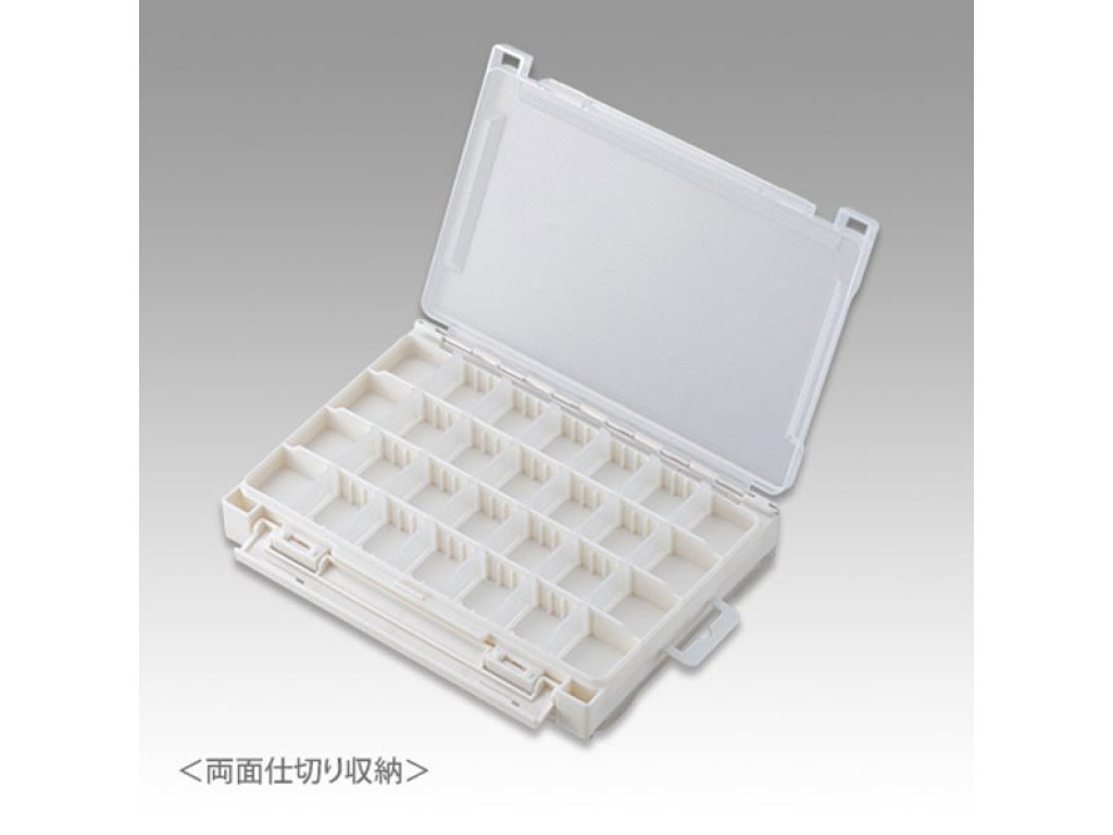 The Meiho Run Gun 3010W double sided plastic utility case is a must have for your small fishing tackle and supplies. This fishing utility case features 24 small removable plastic dividers and 3 fixed partitions on each side of the case. This gives users a total of 48 possible storage compartments.
