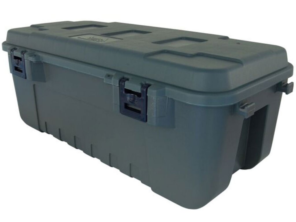 This popular trunk is the Medium Plano Sportsman's Storage Trunk in black that is suitable for all-weathers due to its construction. The storage box is easy to stack due to it's moulded grooves. Other features include four reinforced padlock holes and tie-down brackets with two heavy duty locking latches on each side of the medium size trunk. All Features: