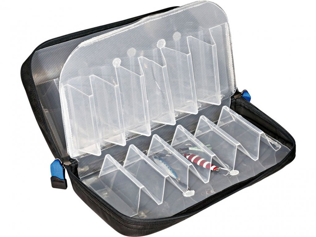 Handbag with four rows of rigid compartments designed to contain hard lures or Egi squid lures. In total, 24 cells with triangular cross section. On the back side, two loops for belt application.