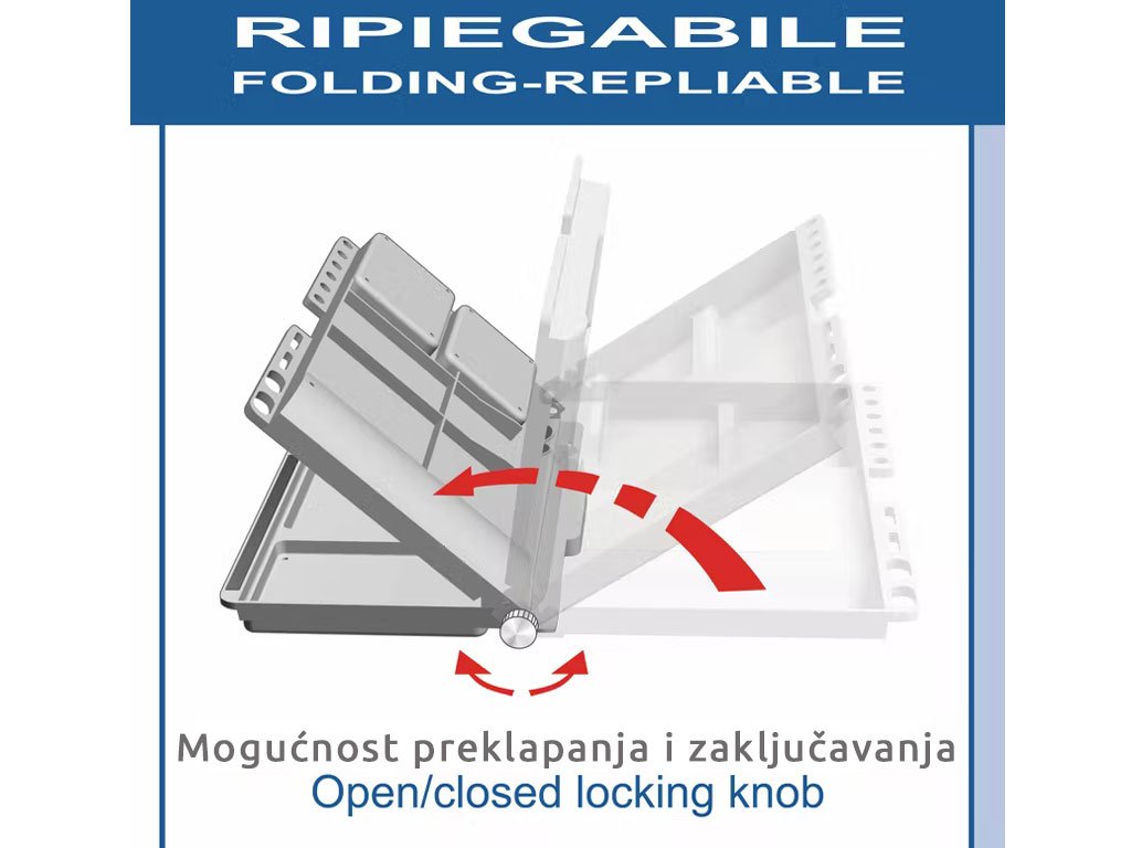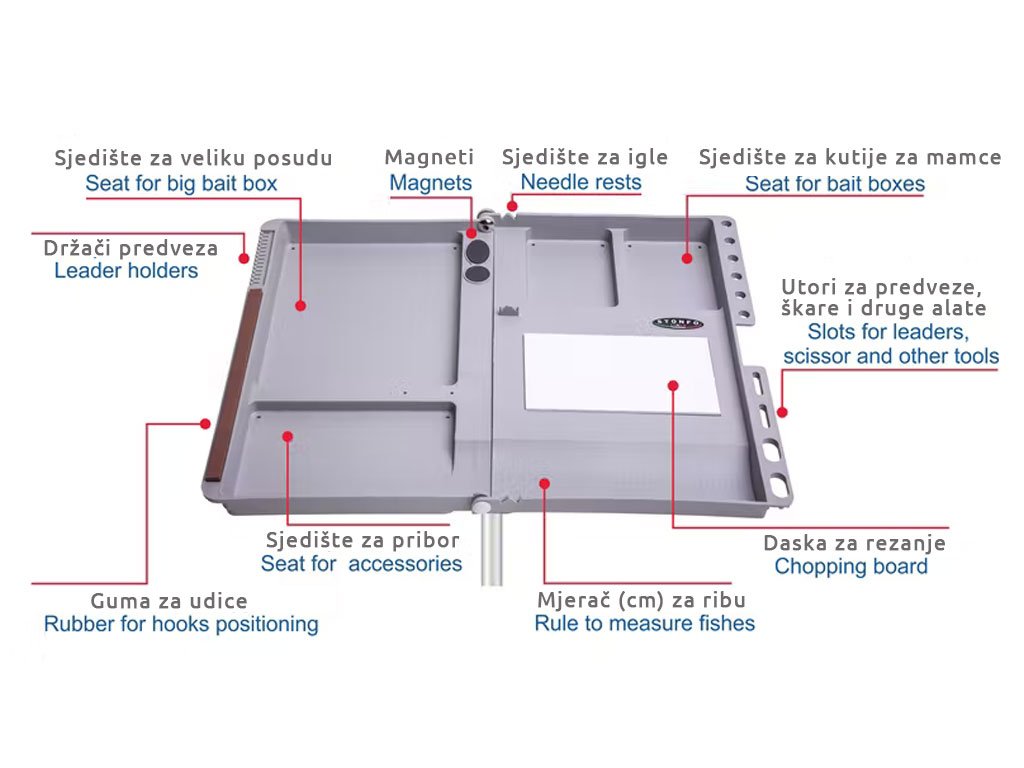 Folding, light weight bait tray designed to meet the many needs of fisherman. Its structure, in durable plastic, is perfectly rounded and has no sharp edges. The compartments can hold various bait boxes in stable position. Other important features make this bait tray a well equipped working station. A universal metal screw connection is placed in the center. Lightweight 700 gr. Dimension 45x36 cm. Minimal space when closed 36x26 cm.