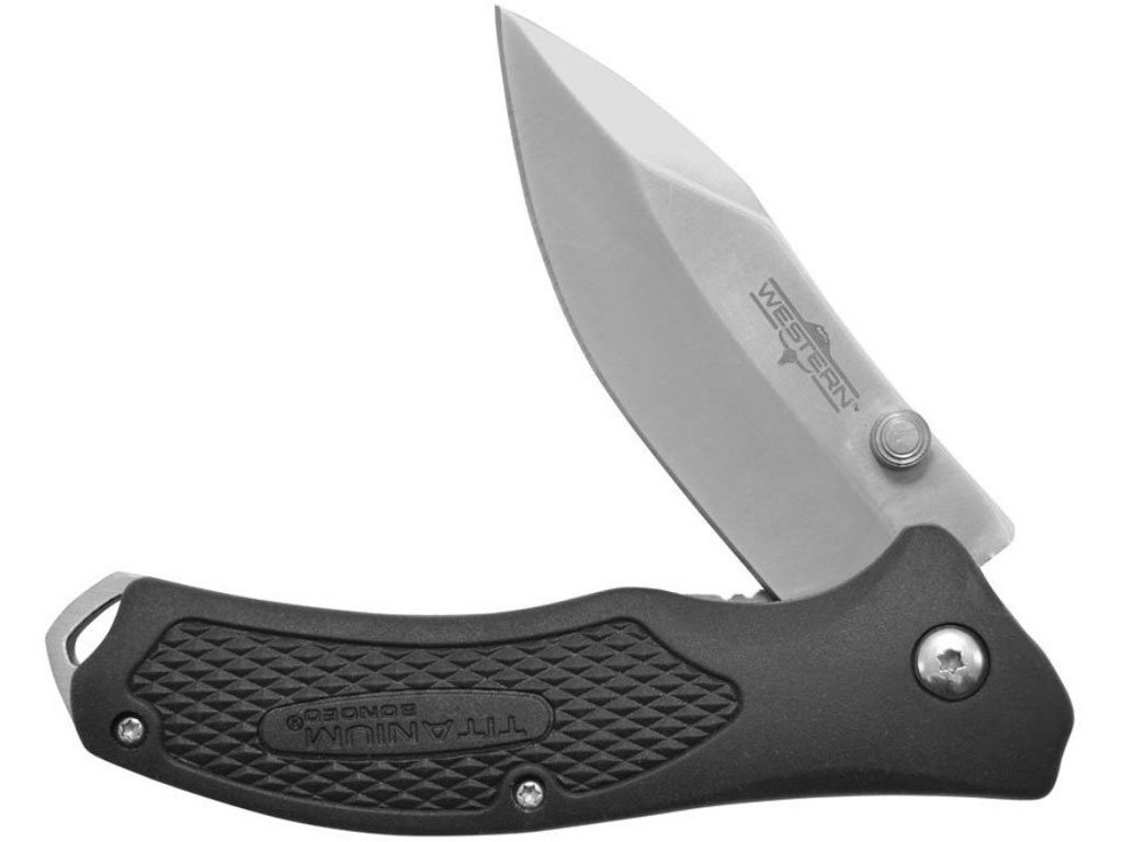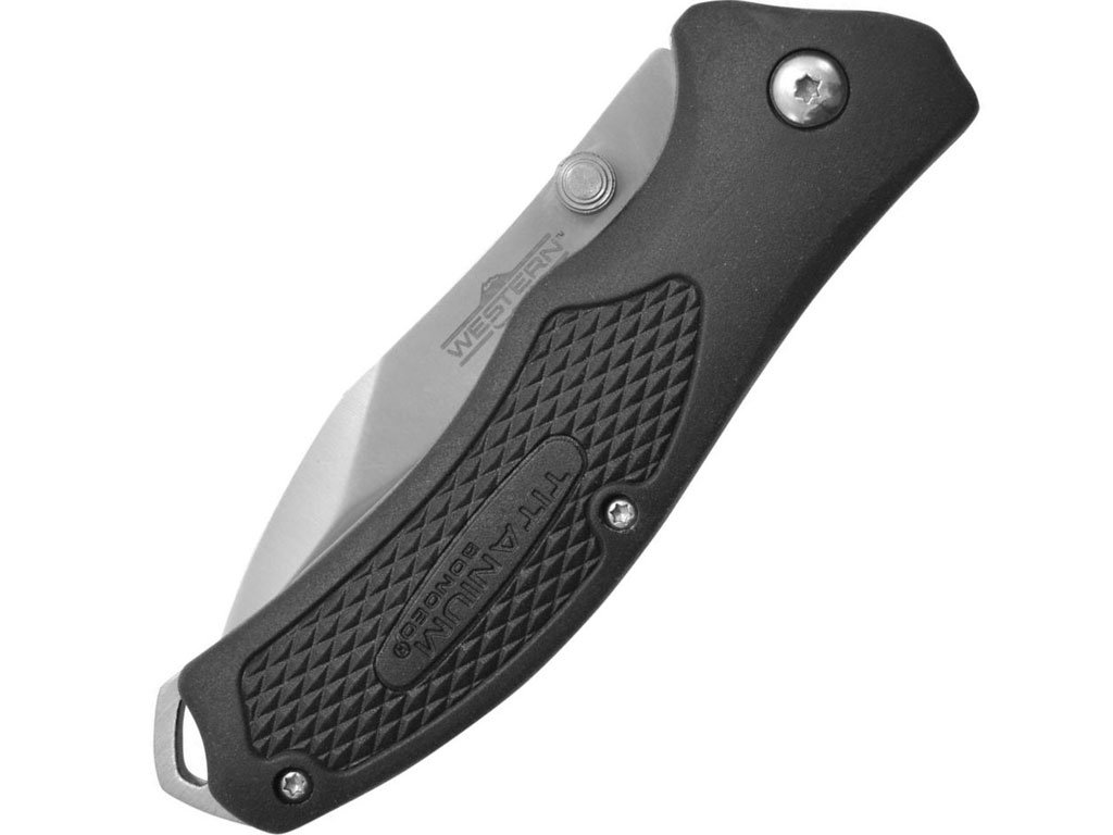 Western BlacTrax 7″ sklopivi nož ima 2,5″ titan 420 oštricu od nehrđajućeg čelika i Full Tang Delrin dršku sa rupom za vrpcu, kao i uključenu navlaku za dodatne mogućnosti pohrane.