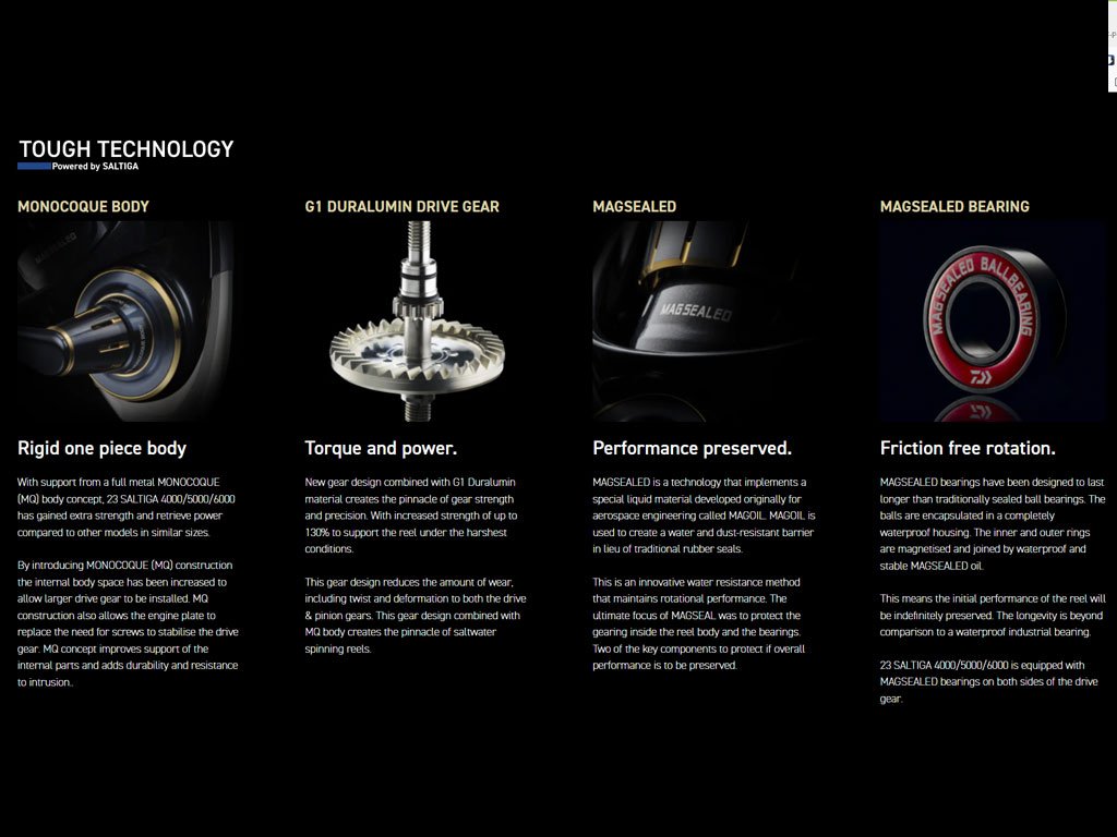 Daiwa SALTIGA 23 definitivno je najiščekivanija rola u novijoj Daiwa povijesti. Ova rola predstavlja vrhunac tehnološkog napretka Daiwe u proteklom desetljeću. Opremljena najboljim od najboljeg te je namjenjena za sve izazove morskog ribolova te svaki je spoj najboljih dostupnih tehnologija.