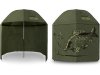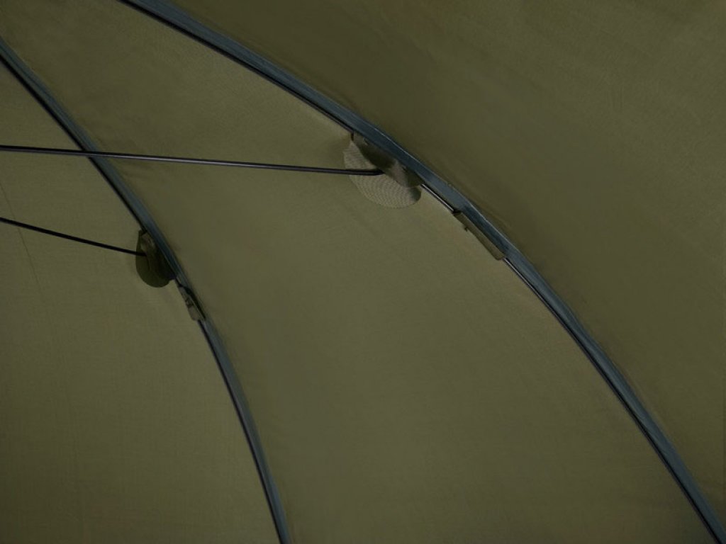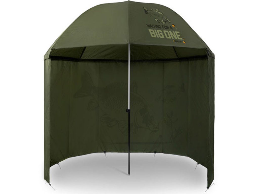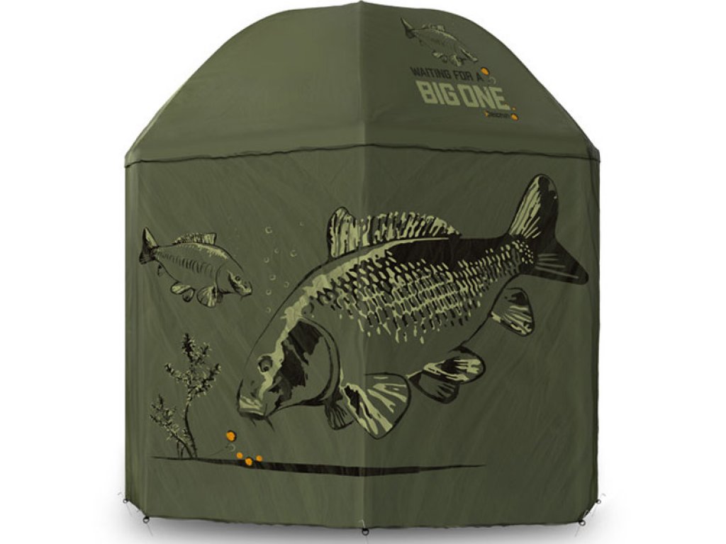 Delphin BigOne Carp je praktičan kišobran koji će vas zaštititi od lošeg vremena. Dizajn je napravljen posebno za šaranske ribiče, s velikim slikama šarana na vrhu i sa strane. Bočne strane vas štite od jakog sunca i vjetra. Dovoljno je velik da u njega stanu 2 stolice i mali stol. Teleskopska šipka omogućuje podešavanje visine kišobrana, a opremljen je šiljastim krajem za guranje u tlo. Šavovi kišobrana zapečaćeni su vodootpornom trakom kako bi se spriječila 100% vlaga tijekom jake kiše. Osim toga, produžene strane pričvršćene su na vrh kvalitetnim patentnim zatvaračem. Donji dio stranica ima ušice koje se klinovima (uključeno u pakiranje) mogu pričvrstiti za tlo.