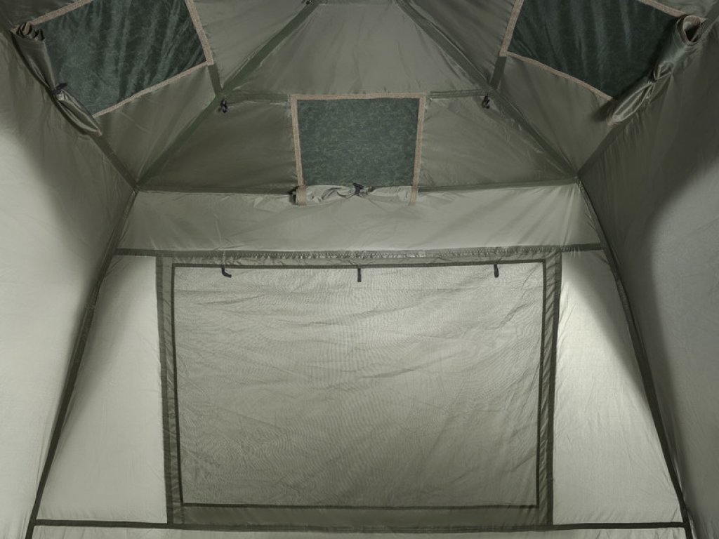 Ako tražite šator s mnogo prostora i udobnošću primjerenom kralju, trebali biste odabrati ništa drugo nego CUBICON AirSPACE C2G. Ovaj model ima stabilnu, djelomično teleskopsku strukturu, dizajniranu za najjednostavnije i najbrže postavljanje. To je obično glavni problem kod velikih šatora, postavljanje oduzima puno vremena, a gotovo je nemoguće to napraviti sam. S CUBICON-om, međutim, nema razloga za brigu, čak ga i brucoš može postaviti za nekoliko minuta. Ali ovaj šator ima više nego što se čini na prvi pogled. Transportne dimenzije sigurno će vas iznenaditi kada usporedite mjere postavljenog i sklopljenog šatorsa. Zato je pogodan i za duga i za kratka putovanja. Satori je dovoljno velik da u njega stanu dva kreveta, a opet ima dovoljno mjesta za kretanje, za vaše torbe i sve što vam je potrebno za ugodan boravak uz vodu. Unutrašnji prostor po potrebi može primiti čak tri kreveta, ali CUBICON nije zamišljen da služi samo kao “spavaća soba”. Baš suprotno! Zbog svoje visine (190 cm) i prostranog interijera, može se koristiti kao dnevno sklonište ili kao prostor za kuhanje. Stoga je svestrano sklonište, a samo na vama je kako ćete ga koristiti. Još jedna velika prednost je razrađen sustav ventilacije koji se sastoji od nekoliko prozora i poklopca. Na prednjoj i stražnjoj ploči postavljen je prostrani komarnik, a četiri manja prozora su direktno na stropu šatora. Na taj način zrak može strujati unutra kada ne možete prozračiti cijeli bivak pomoću velikih prozora. Sigurno ćete ga cijeniti noću, kada će pomoći u smanjenju kondenzacije na unutarnjim stijenkama. Dodatnu zaštitu od sunca i kiše pruža kapuljača iznad ulaza. Krov je pričvršćen za cijelu konstrukciju brojnim kopčama kako bi se izbjeglo nepotrebno pomicanje zbog vjetra. CUBICON također ima 4 stabilizirajuća užeta i klinove uključene u paket, te standardni pod fiksiran kvalitetnim patentnim zatvaračem na cif. Nema više prljavštine ili neželjenih posjeta glodavaca!