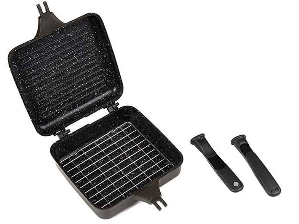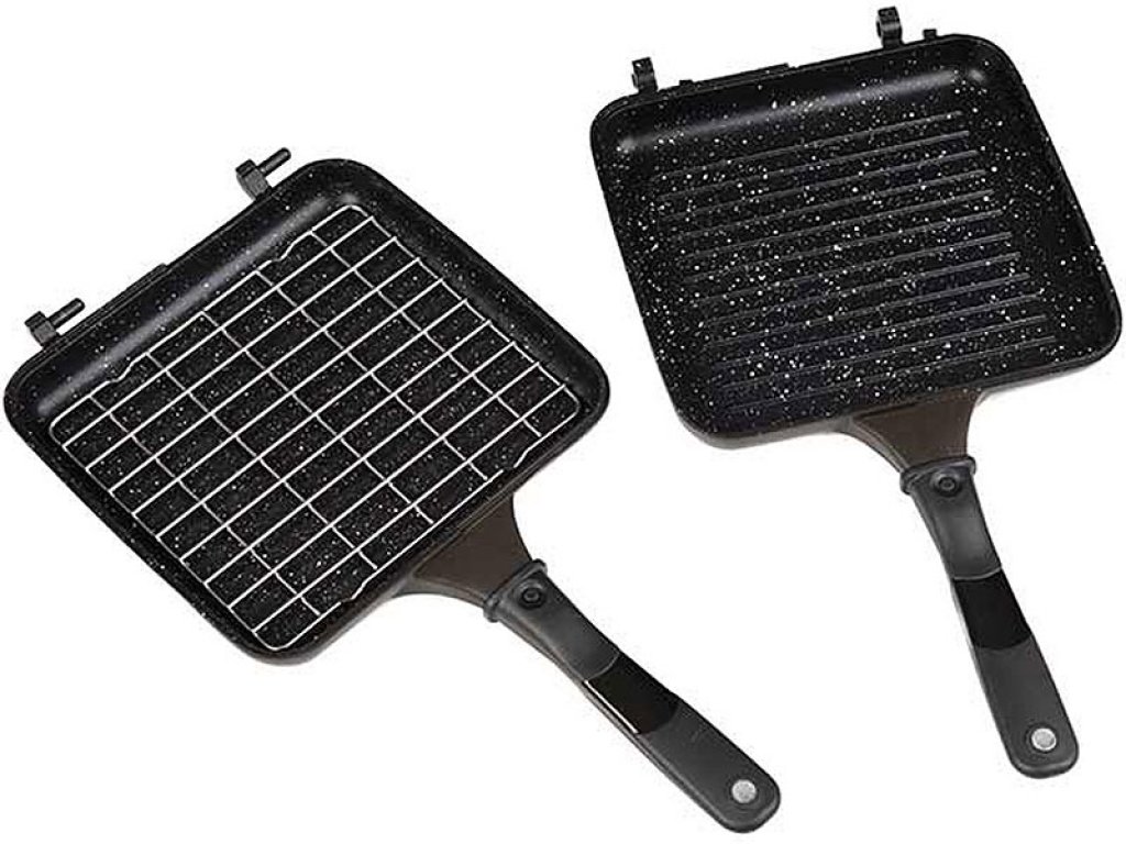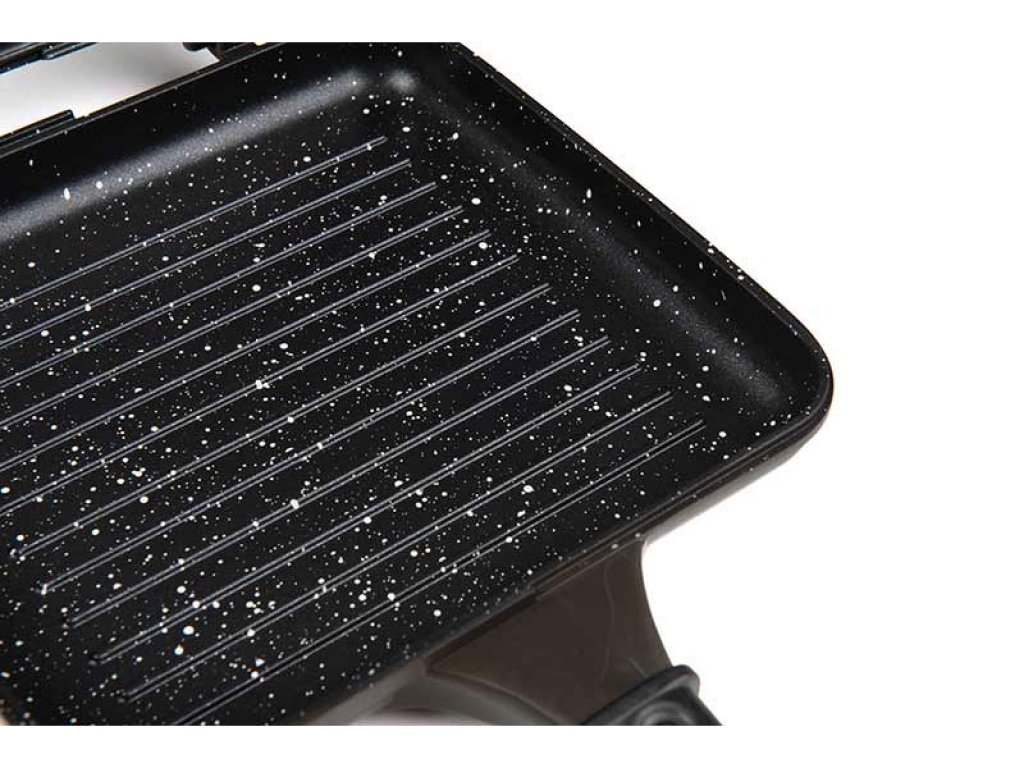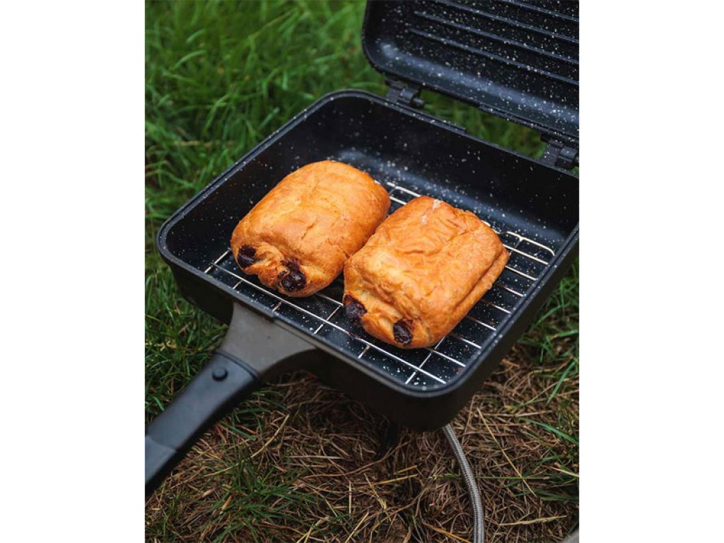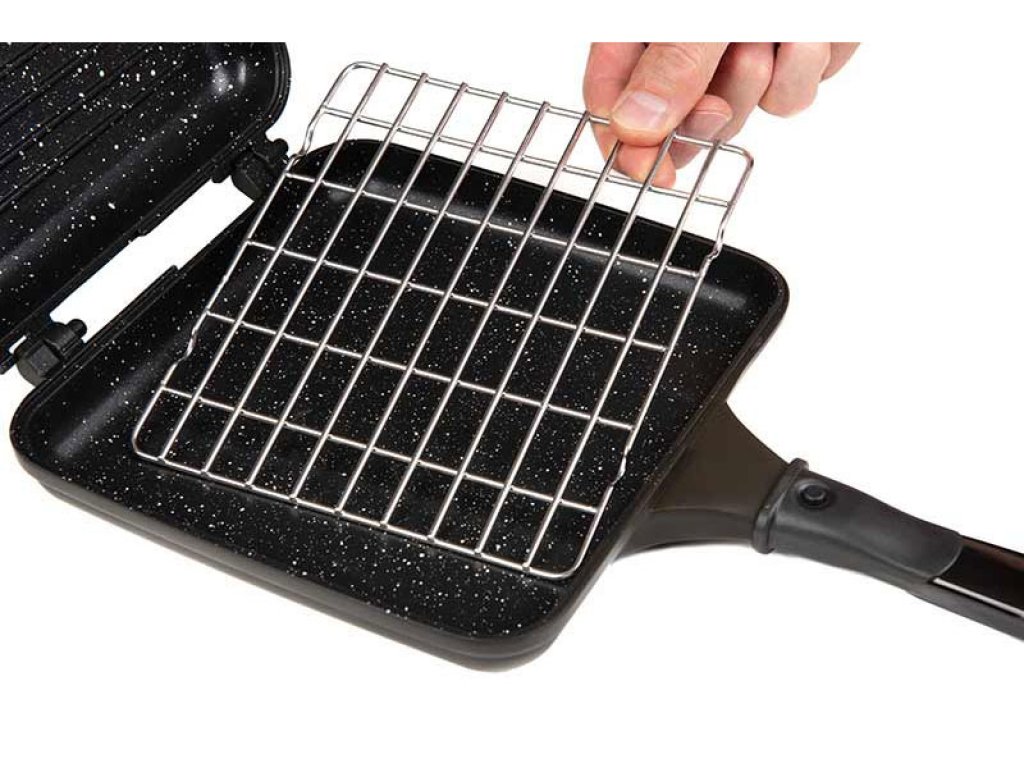 Multi funkcionalna tava zelene boje s keramičkim premazom protiv prianjanja hrane. Konstrukcija od lijevanog aluminija. Uključena i rešetka od nehrđajućeg čelika za pripremu punjenih peciva, pita, pizza itd. Sprječava doticaj hrane s dnom i zagorijevanje. U potpunosti je odvojivo posuđe, svaki dio možete koristiti samostalno. Ručke su lako uklonjive za kompaktnije skladištenje i transport. Posuđe se može koristiti isključivo na plinskim plamenicima. Dolazi u neoprenskoj zaštitnoj torbi.