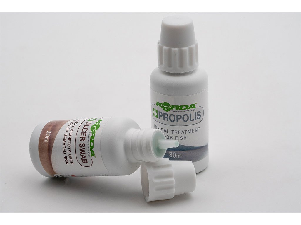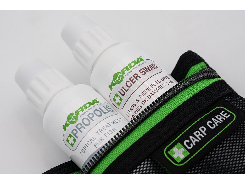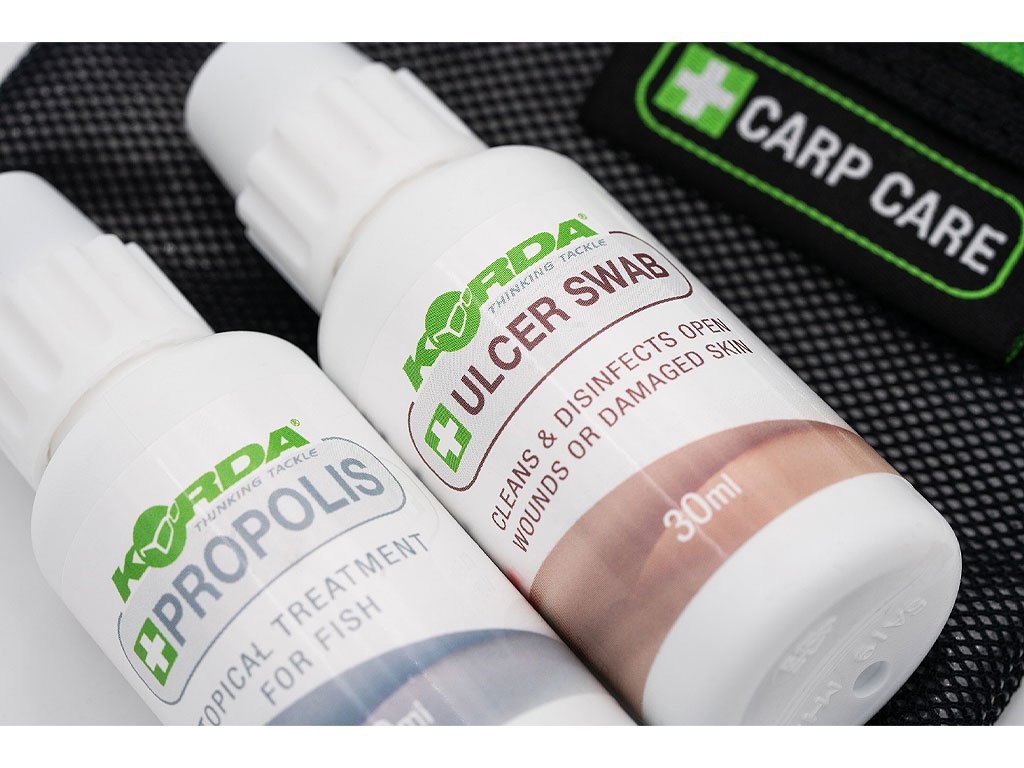 Carp Care Kit dolazi u vrećici s patentnim zatvaračem i sadrži 30ml propolisa i 30ml tekućine za tretiranje rana Ulcer Swab. Ulcer Swab dizajniran je za čišćenje i dezinfekciju ogrebotina, čireva i drugih rana bilo gdje na tijelu ribe, čime se sprječava da se područje zarazi bakterijama ili gljivicama. Propolis, koji je prirodan proizvod dolazi od pčela i ima antibiotska i antimikrobna svojstva te se može primijeniti kako bi se zatvorilo područje i spriječilo da bilo što uđe u očišćeno područje. Kada se koriste zajedno svakom oštećenju daju najbolju šansu za izlječenje. Komplet sadrži bočicu od 30ml od svakog, Ulcer Swaba i propolisa.