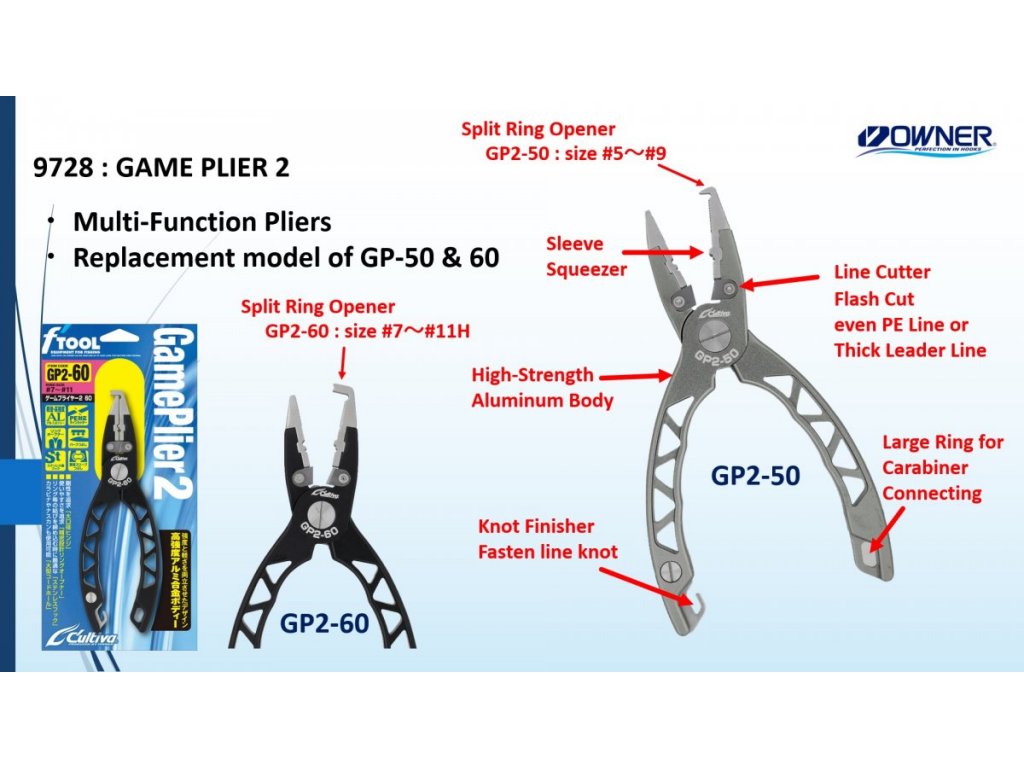 Owner vrhunska big game kliješta. Namijenjena su za najjače i najčvršće split ringe. Napravljena su od aliminijske legure velike snage koja im omogućava da istovremeno budu izuzetno lagane i vrlo jake. Kliješta uključuju škare za rezanje upredenice i dio za stiskanje spojnica. Model GP-50 namjenjen je za ringe u veličinama od #5do #9 dok je model GP60 namjenjen ringama veličine #7 do #11.
