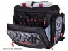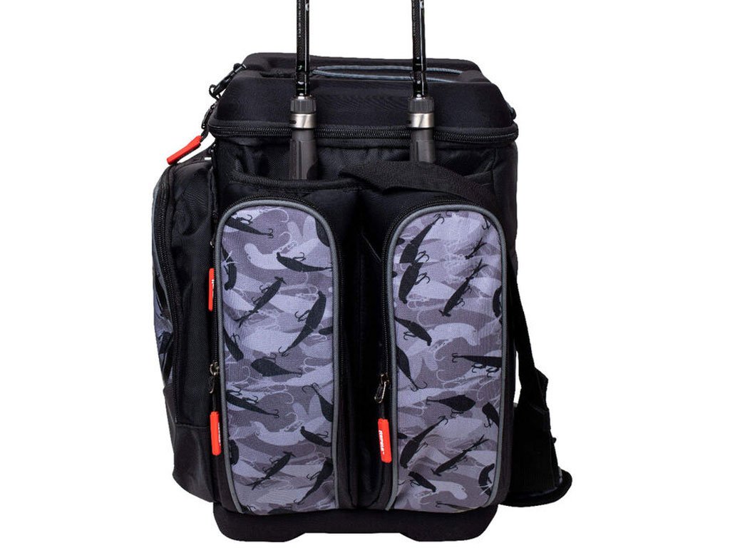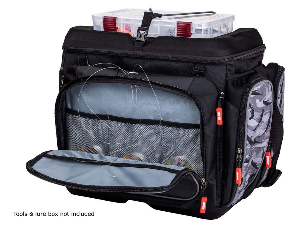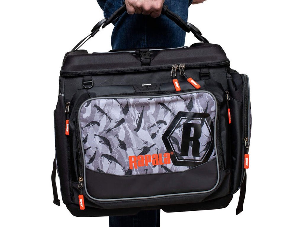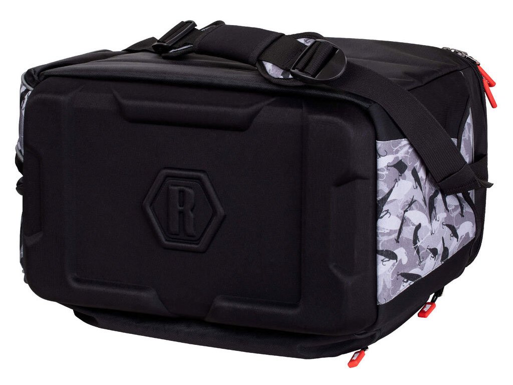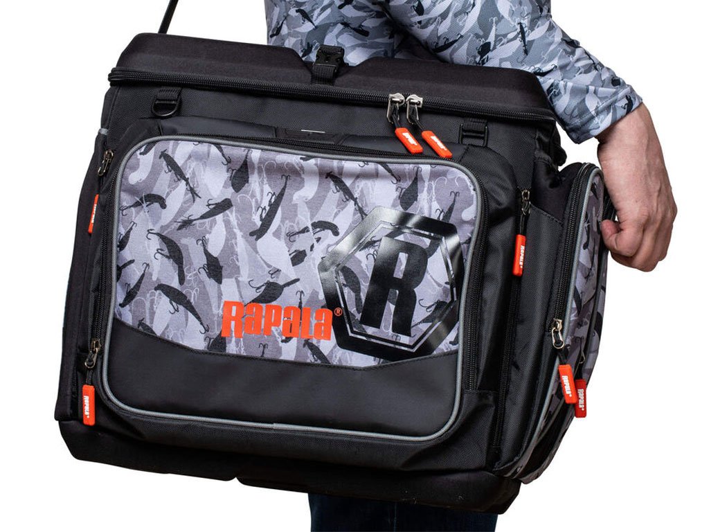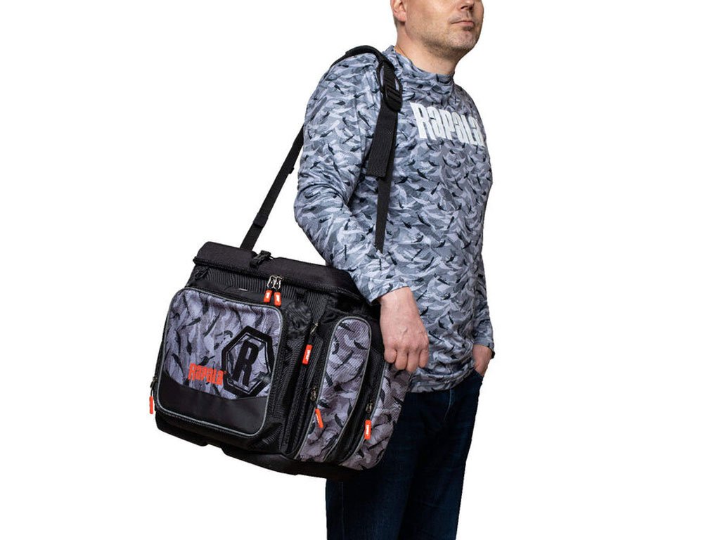 Vodootporna Rapala LureCamo tkanina sa izlivenim, vodootpornim EVA dnom. U torbu se može posložiti 7 kutija u veličini 3700, plus još jedna na vrh za brzi pristup favoritima. Višeslojni prednji džep predstavlja odlično mjesto za pohranu pribora, a tu su i brojni džepovi za sitnice te D ringovi za vješanje raznih alatki. Unutar poklopca nalazi se prozirni džep sa patentom. Neoprenske površine na bočnim džepovima povećavaju kapacitet. Podstavljena, podesiva naramenica koja se može namjestiti kako bi preuzela ulogu ručke za nošenje. YKK patenti. Kutije za pribor nisu uključene.